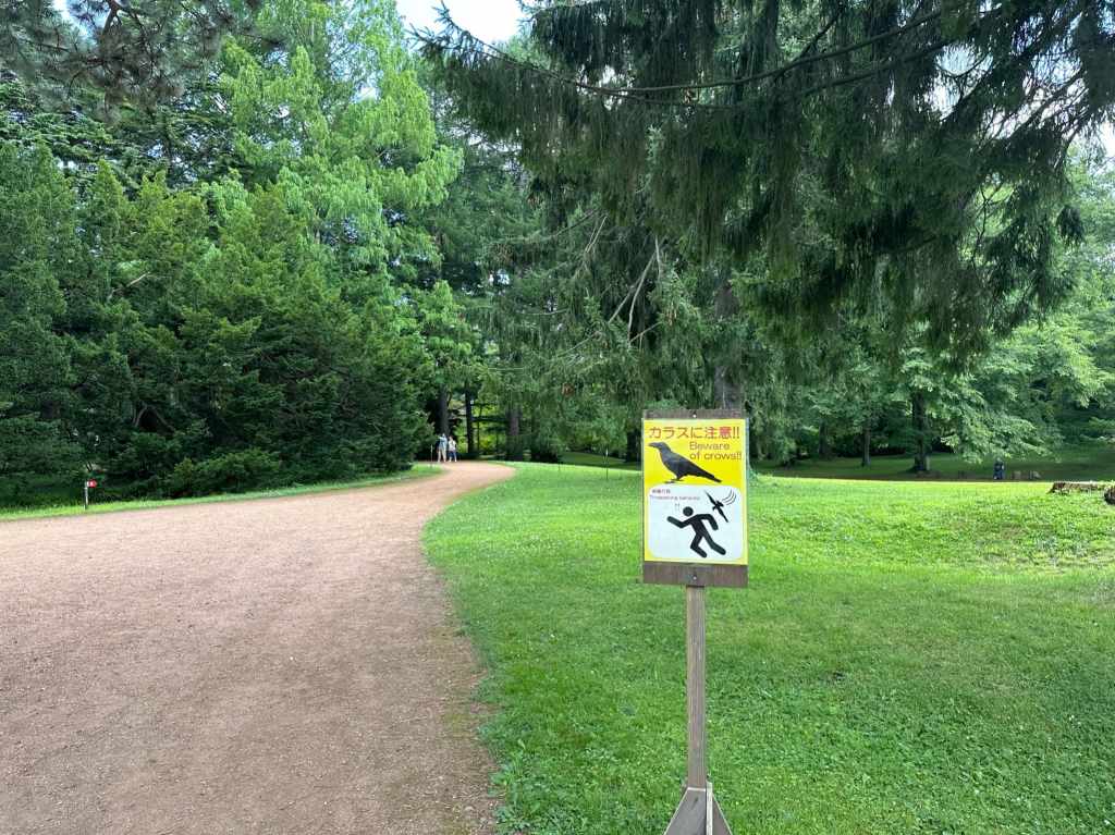 第一天的第一站就獻給背包客棧附近的北海道大學植物園了。裡頭並沒有太多的遊客,不過這反而有點可怕,當我走進一條小徑,轉了一圈沒有任何的人類,只有三隻烏鴉近在咫尺(真的很近!)。園區裡設有許多要注意烏鴉的標語,我腦中全是這三隻烏鴉同時朝我頭上衝過來,開始奮力啄我的腦袋瓜的畫面。
